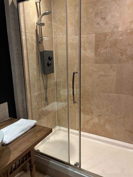 A good nights rest is assured in both bedrooms, with the same breath taking views directly overlooking the castle and esplanade, thanks to the comfortable orthopaedic mattresses. Each bedroom has a built in wardrobe providing ample space for even the most demanding fashionista. You will also find an ironing board, iron and hairdryer in each room so you don’t have to wait for others to get ready. The main bedroom is set up as a standard double and the other bedroom can either be set up as a king size or a twin as required. Our extra wide luxury shower room is finished in travertine tiling and has a 10kw shower.